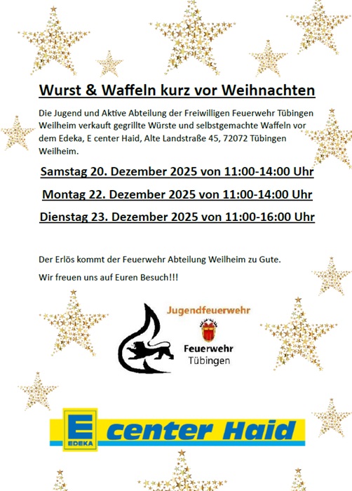 Die Jugend und Aktive Abteilung der Freiwilligen Feuerwehr Tübingen Weilheim verkauft gegrillte Würste und selbstgemachte Waffeln vor dem Edeka, E center Haid, Alte Landstraße 45, 72072 Tübingen Weilheim. Samstag 20. …