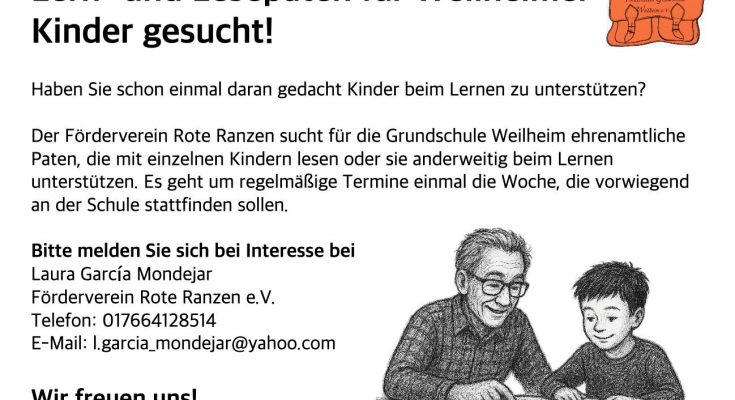 der Förderverein der Grundschule Weilheim Rote Ranzen e.V. sucht weiterhin ehrenamtliche Lern- und Lesepaten für Kinder aus Weilheim.