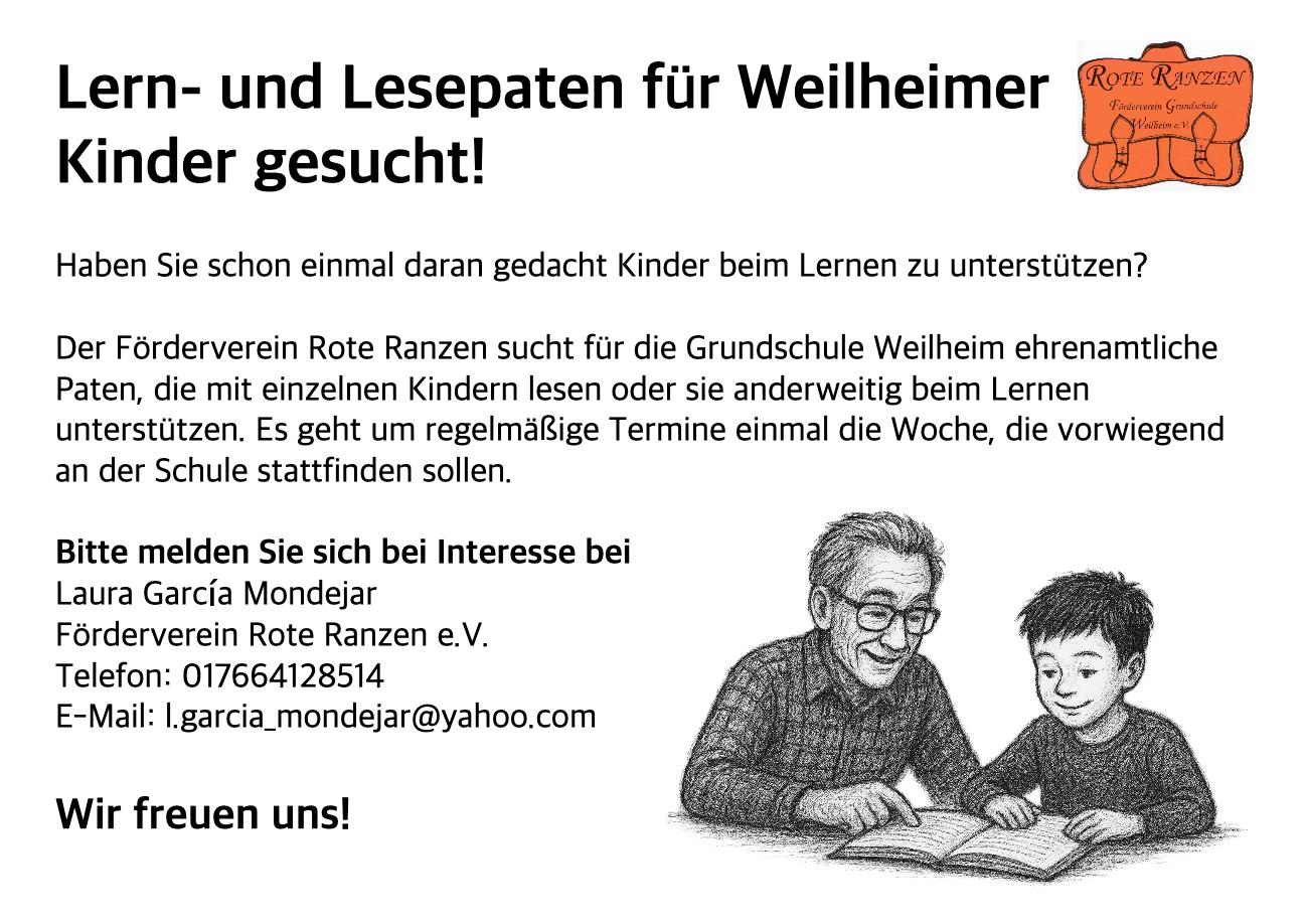 der Förderverein der Grundschule Weilheim Rote Ranzen e.V. sucht weiterhin ehrenamtliche Lern- und Lesepaten für Kinder aus Weilheim.